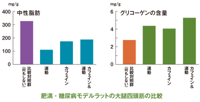 「インスリンの働きが悪くなると、筋肉や肝臓に中性脂肪が溜まり、グリコーゲン(糖類)の貯蔵量が減ってきます。つまりインスリン抵抗性が亢進すると、糖尿病に近づくわけです。しかし運動をすれば、中性脂肪が減ってグリコーゲン含量が増える。コーヒーを飲んでも同じような効果が得られますから、運動とコーヒーを併用したらどうなるかと考えたのです」