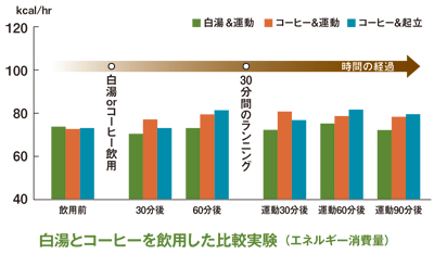 運動する前にコーヒーを飲んだ場合は白湯と比べてより多くエネルギーを消費していることが分かる。運動後も、コーヒーを飲んだ場合は30分後、60分後、90分後もエネルギー消費量は高いまま維持されている。