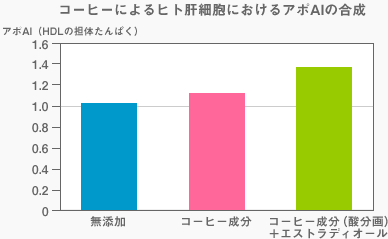 ヒト肝細胞にドリップコーヒーを加え、細胞の変化を調べたところ、HDLの主要たんぱくであるアポAIの合成を上げることが分かりました。