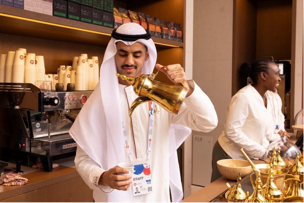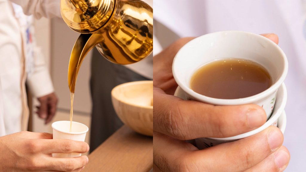 そして、会場内でも存在感を放つサウジアラビアのパビリオン。こちらのカフェでは、巷で話題の「サウジコーヒー」に注目!日本人にはあまりなじみがないかもしれませんが、こちらは「アラビックコーヒー」と呼ばれている、中東の伝統的なコーヒーです。浅く炒ったコーヒー豆を”カルダモン”と一緒に煮出し、アラビアデザインのポッドに淹れて提供されます。かつて遊牧民であったアラブの人々が、砂漠を旅している最中に夜空の星を見ながら淹れて楽しんだコーヒーと言われています。なんともロマンチックです。