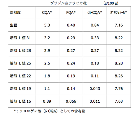 クロロゲン酸類は,コーヒー豆から初めて見つかった物質で,ポリフェノールと呼ばれる多くの機能性を有する物質群の1つです。クロロゲン酸類は,脂肪の吸収抑制,発がん予防,糖尿病予防などの機能性について報告されています。クロロゲン酸類にも多くの種類がありますが,コーヒー生豆には,カフェオイルキナ酸(CQA),フェルロイルキナ酸(FQA),ジカフェオイルキナ酸(di-CQA)が多く含まれています。今回,コーヒー豆の焙煎度の違いと品種(ブラジル産カネフォラ種ロブスタ(コニロン)とアラビカ種)の違いによる,これらのクロロゲン酸類と(総)ポリフェノールの含有量について調べました。